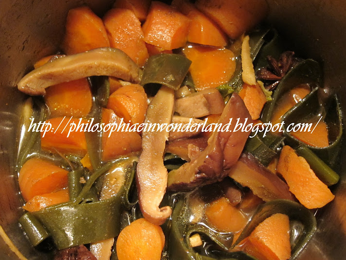 1. 放入紅蘿蔔只是因為它也是耐煮食材,也可為深色的海帶加點顏色。