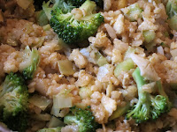2. 再補些些油,加入洋蔥丁。稍炒香後,先加入花棷菜枝幹的部分,再加入飯,再加入剩下的花椰菜。